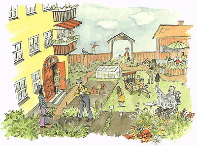 Vi anser att lägenhetsträdgårdar och odlingslotter är viktiga inslag i bostadskvarter. Det bidrar starkt till grannkontakter, ökat engagemang och välbefinnande. Det leder i sin tur till minskat slitage och billigare förvaltning. Gårdar med flera sittgrupper är också bra för detta.