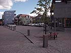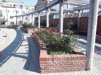 Pergola och rosplantering på Järla Sjös största torg. Pergolan ger svalkande skugga till sittplatserna under den.