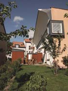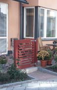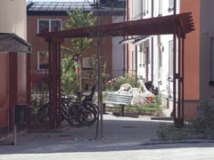 Bostadsgårdens entré markerad med en pergola och gränsen mellan privat uteplats och offentligt miljö markeras med häck och grind.