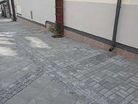 Varierad markbeläggning i Järla Sjö med smågatstensränna för regnvatten.