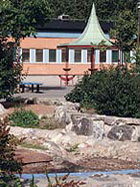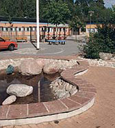 Utemiljö på Bredbyskolan med damm, solur och flaggstång